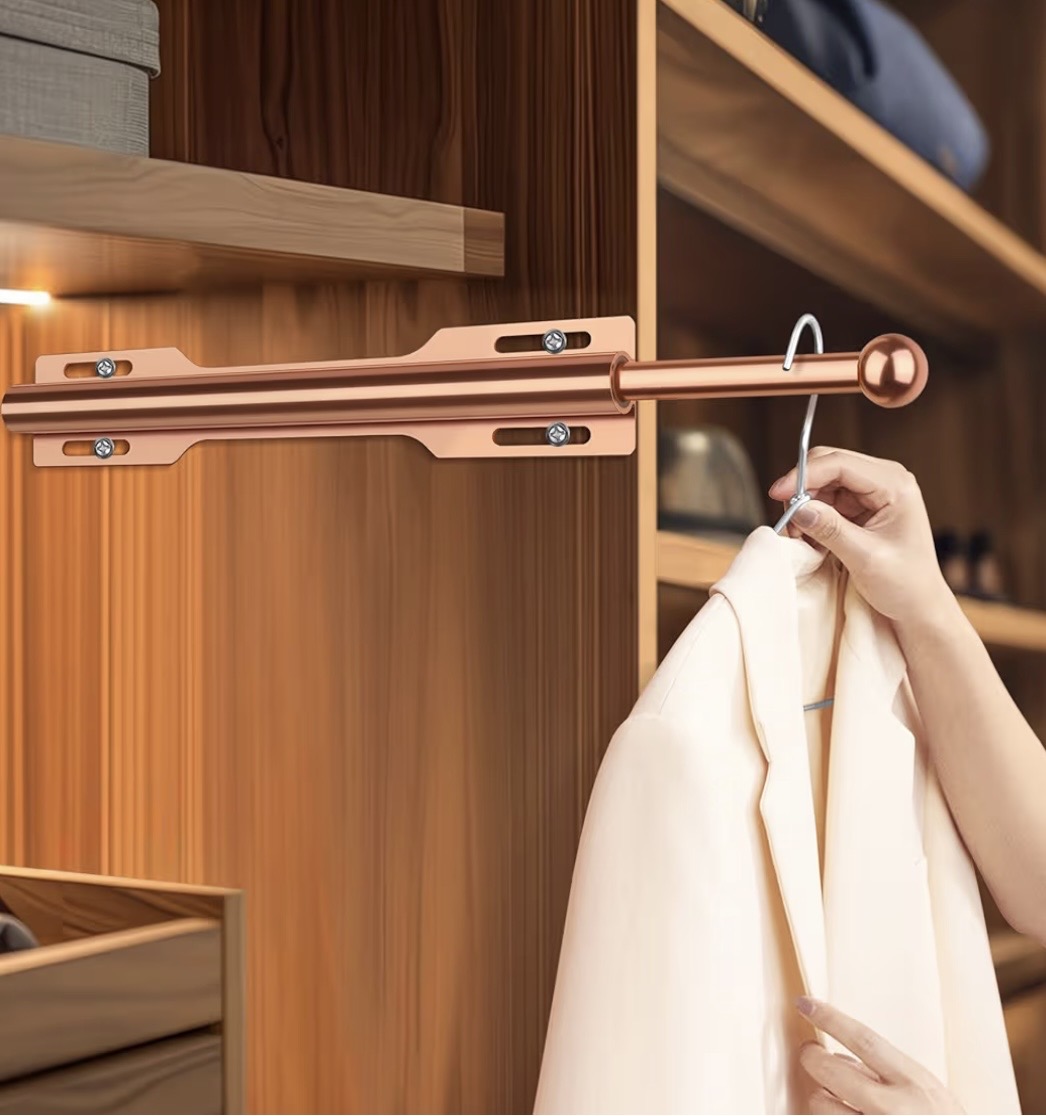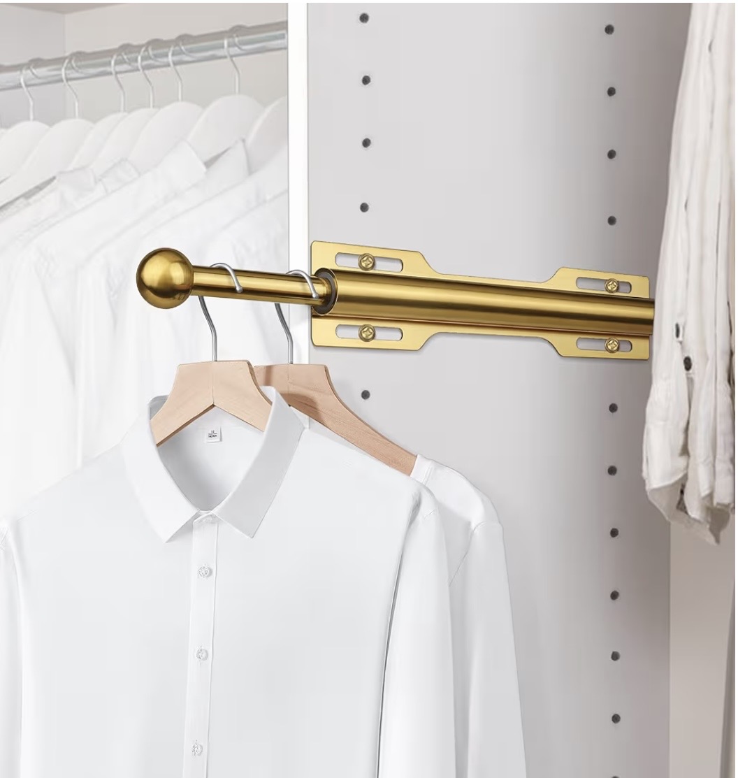 Hace poco descubrí la barra valet de FIRJOY: una varilla retráctil —o barra extraíble—que se instala en walk-in closets para colgar ropa de forma temporal. Mide 12″ y está hecha de acero aleado, lo que la hace resistente y duradera. Así que, tranquilas, porque puede soportar el peso de varias prendas sin doblarse ni romperse. Además, su superficie suave evita que la ropa se enganche.